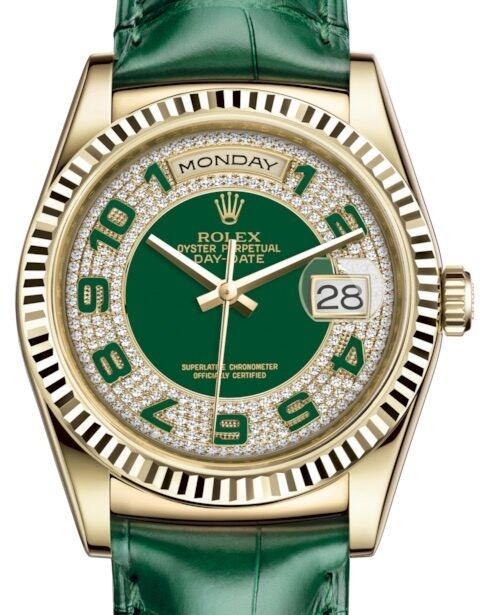 Rolex Day-Date 36 Yellow Gold Green Diamond Paved Arabic Dial & Fluted Bezel Green Leather Strap 118138 - BRAND NEW