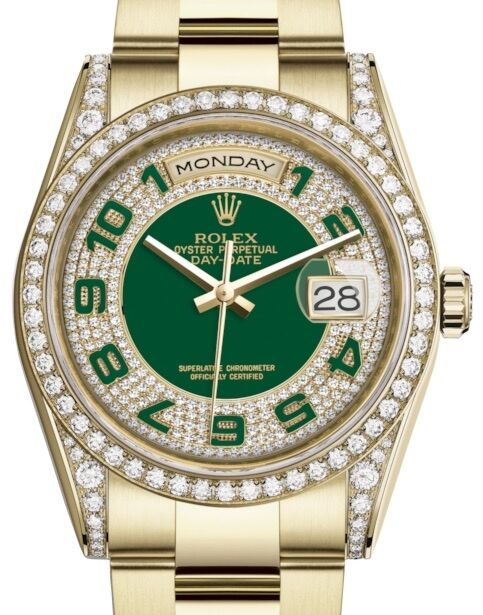 Rolex Day-Date 36 Yellow Gold Green Diamond Paved Arabic Dial & Diamond Set Case & Bezel Oyster Bracelet 118388 - BRAND NEW