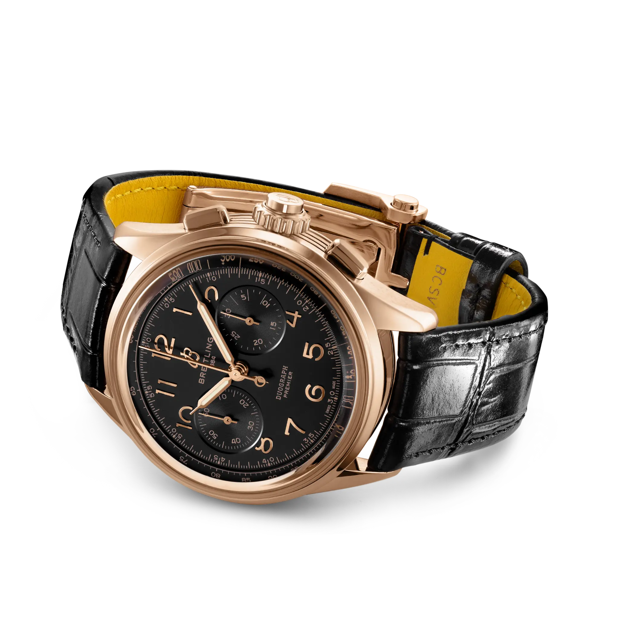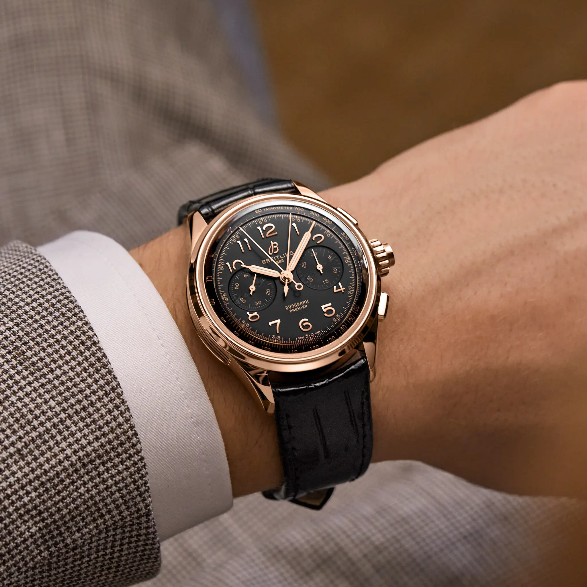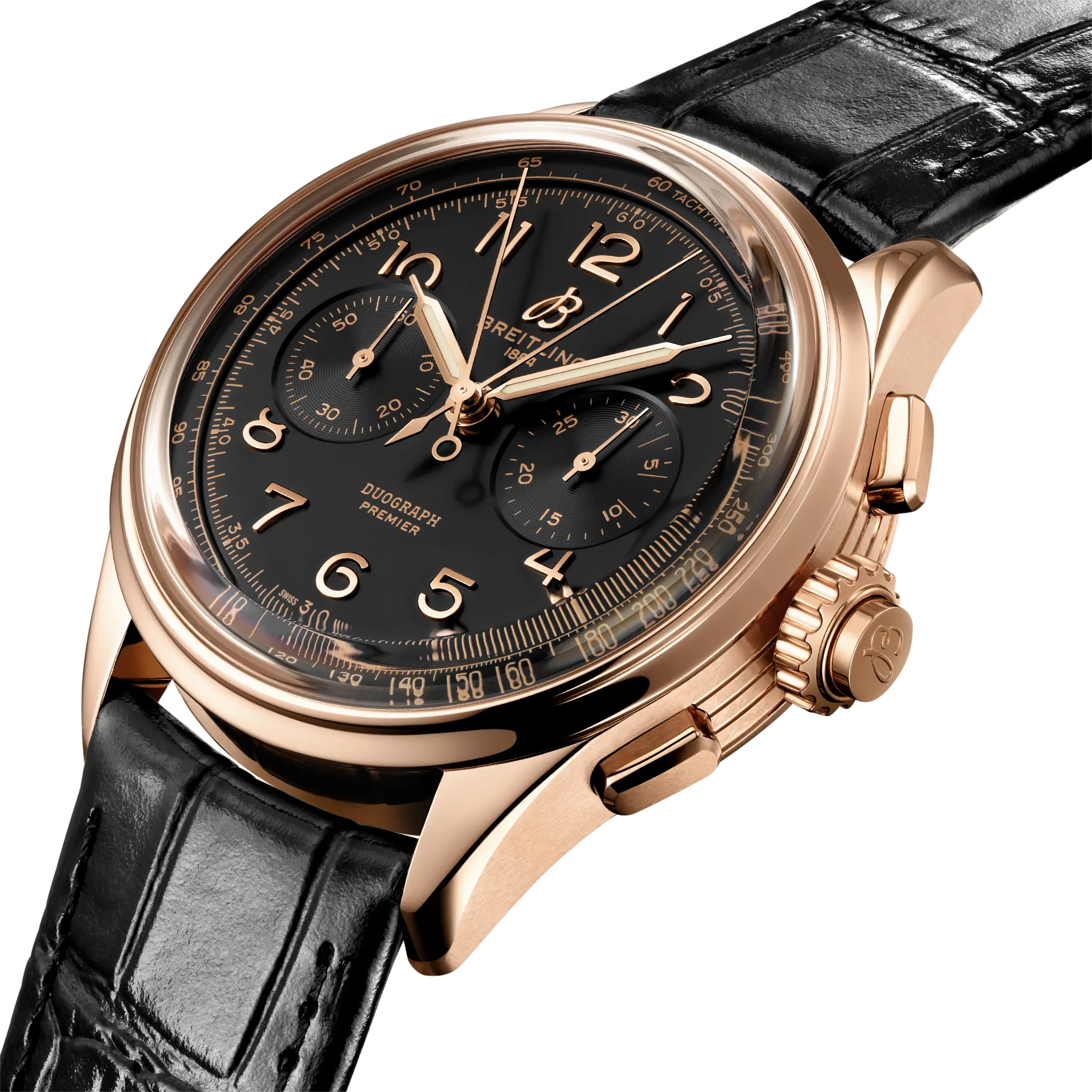 Paying homage to three generations of inventors – Léon, Gaston & Willy Breitling – the Premier Duograph displays Breitling’s watchmaking expertise with its split second complication. As Willy Breitling said, the Premier is an “unmistakable stamp of impeccable taste”. This latest generation of Premier chronographs brings its timeless elegance back to life, and showcases Breitling’s highest level of watchmaking thanks to a range of iconic Premier complications: the Chronograph, the Duograph and the Datora. Featuring rectangular chronograph pushers, bi-compax chronograph look and Arabic numerals, the heritage-revived Premier chronographs display a variety of elegant design details such as grooves on the case-sides, open sapphire casebacks and vintage-inspired hands.