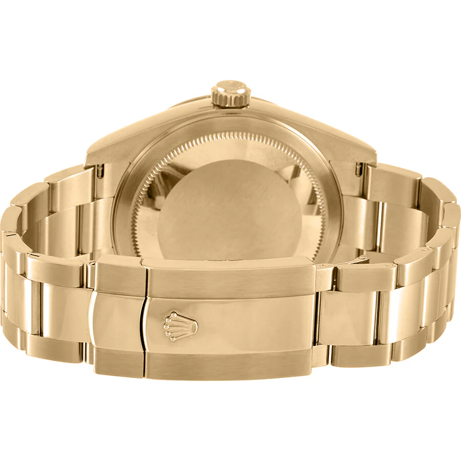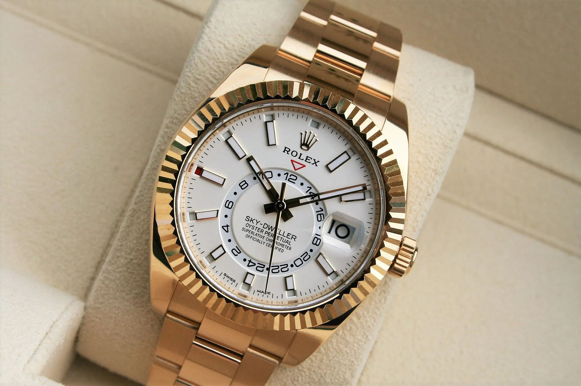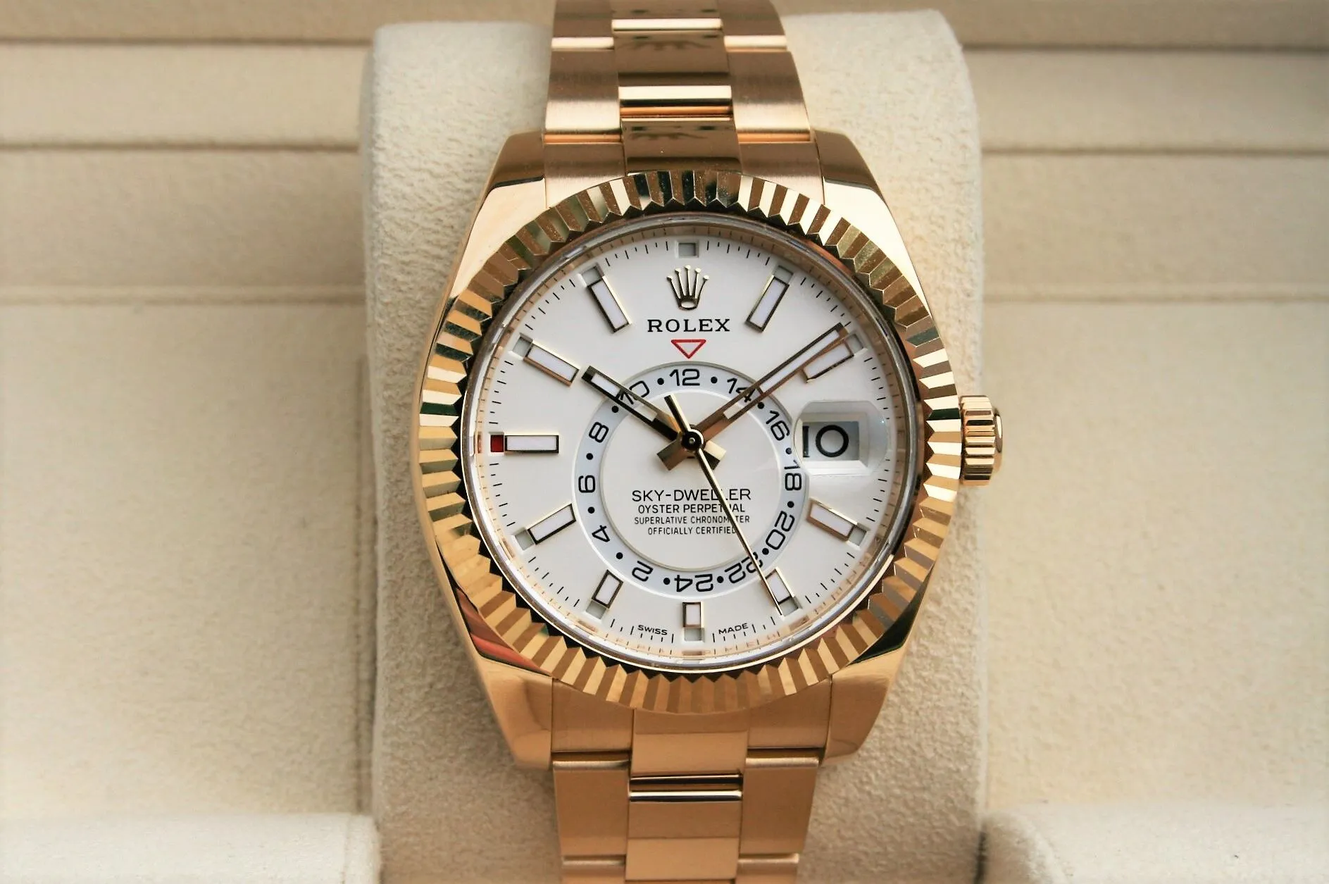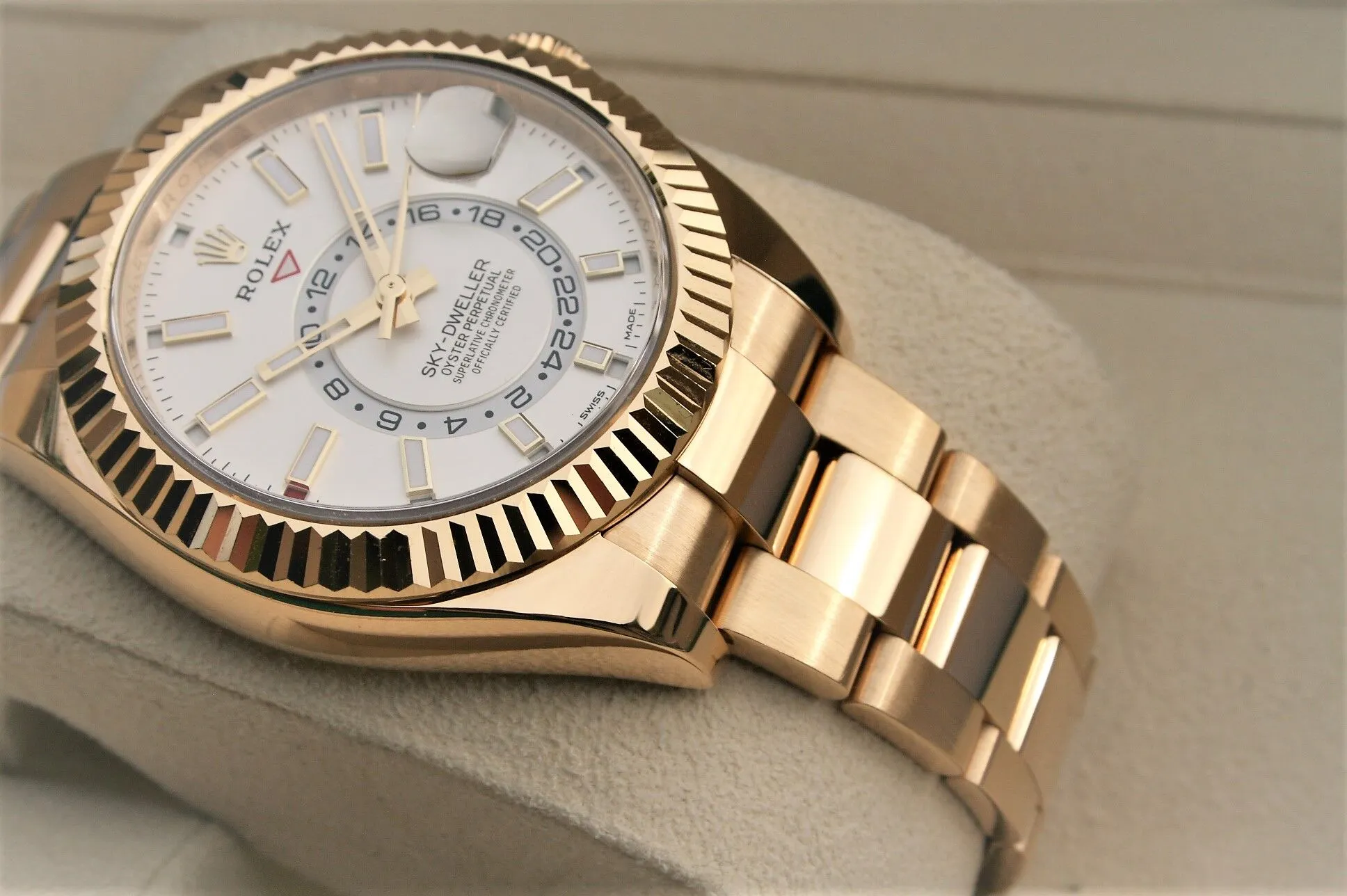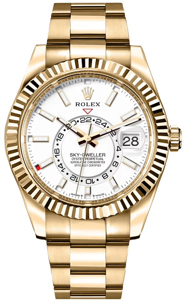 42mm 18K yellow gold case, screw-down caseback and winding crown with Twinlock dual waterproofing system, fluted bezel, scratch-resistant sapphire crystal, solid white dial, mechanical self-winding Rolex caliber 9002 perpetual calendar with dual time-zone yearly calendar display featuring a central hour, minute, and second hand. 24-hour display on an off-centered disk. Second time zone. instantaneous annual calendar and quick date setting at 3 o'clock. Month displayed through 12 windows on the circumference of the dial. Stop-second device for precise time setting. Water-resistant to 100 meters.