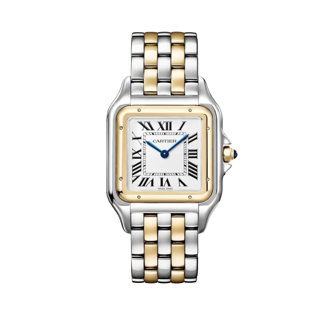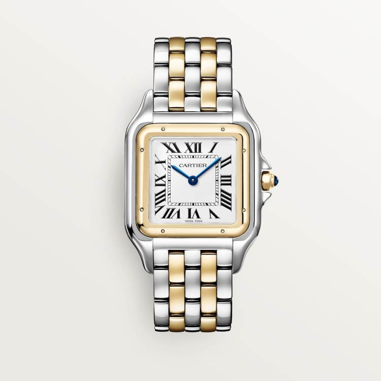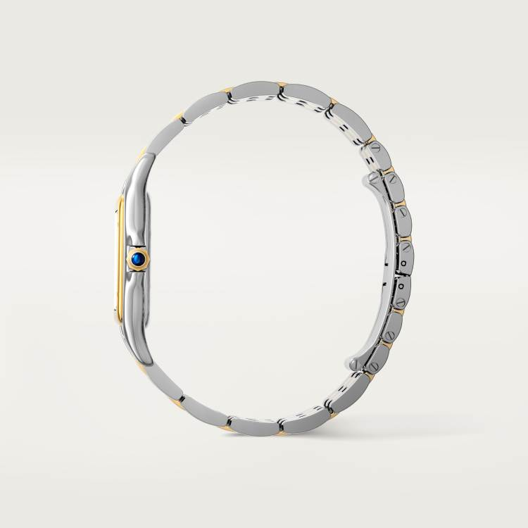 Panthère de Cartier watch, large model, quartz movement. 750/1000 gold and stainless steel case, size: 31 mm x 42 mm, thickness: 6.71 mm, crown set with a blue synthetic spinel, silver-plated dial, sword-shaped blue steel hands, 750/1000 gold and stainless steel bracelet. Water-resistant to 3 bar (approximately 30 meters).