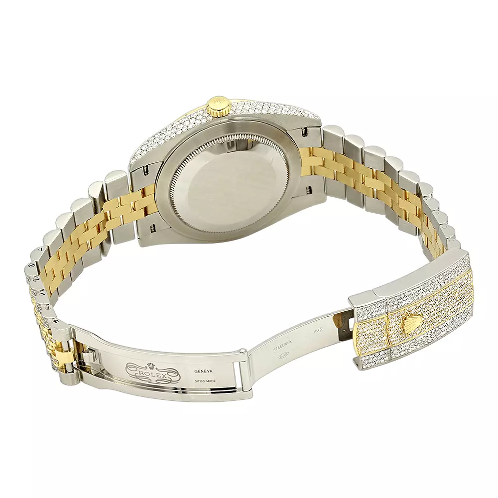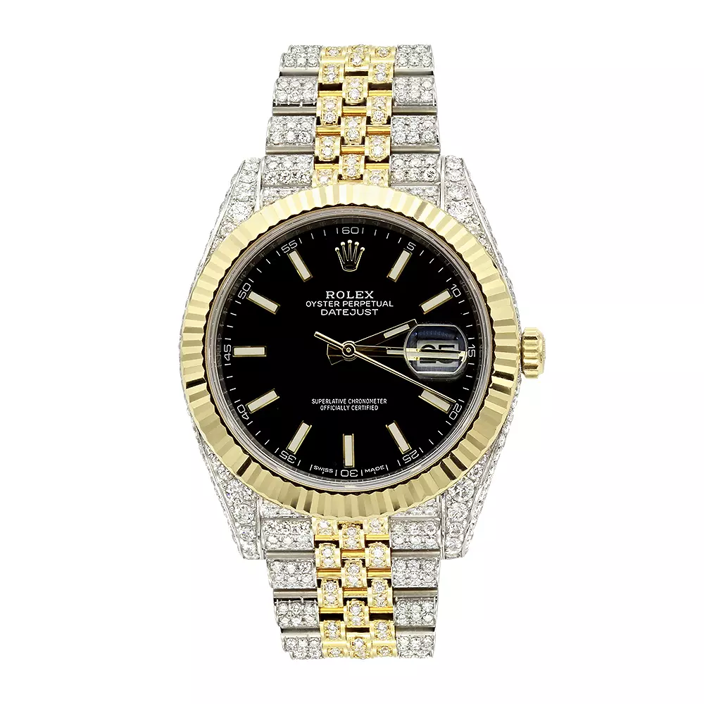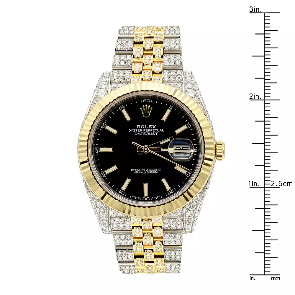 This gorgeous Custom Rolex Datejust Diamond Watch for Men in Two Tone Gold and Stainless Steel features 12 carats of dazzling genuine round cut diamonds masterfully set on its band and case, a brushed stainless steel case, and yellow gold bezel for a classic two-tone look. This Rolex Men's Diamond Watch showcases a black dial and a date display at the 3 o'clock position. This custom Rolex diamond watch is pre-owned, in like new condition, and comes with a 5-year warranty from ItsHot.com. These pre-owned Rolex watches are authentic Rolex watches with genuine diamonds, in excellent condition, they are checked for authenticity and basic water resistance. Watches will withstand an occasional rain just fine, but they are not diver's watches and should not be worn in shower or while swimming.