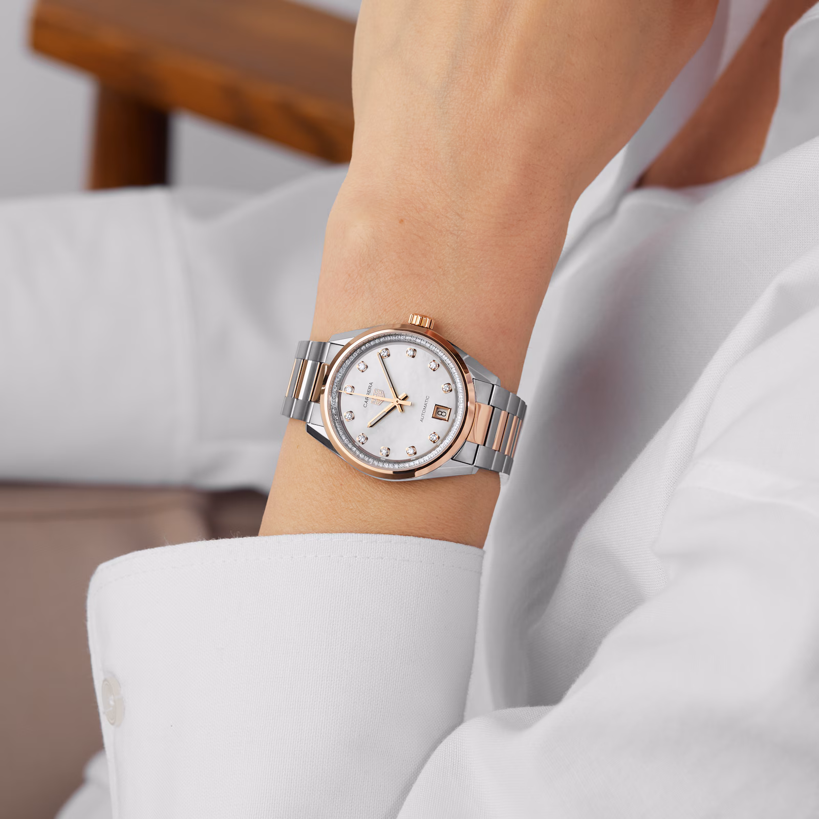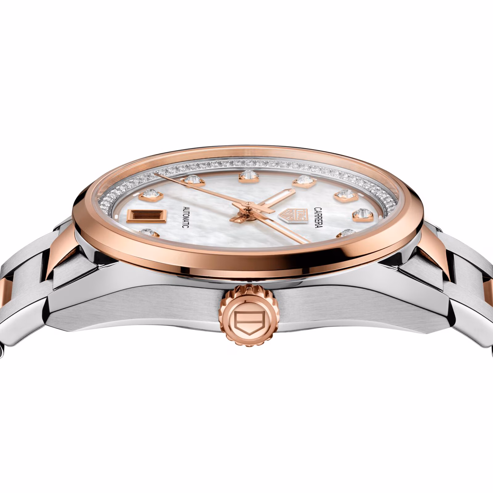 - White mother of pearl dial with diamond dotted hour markers