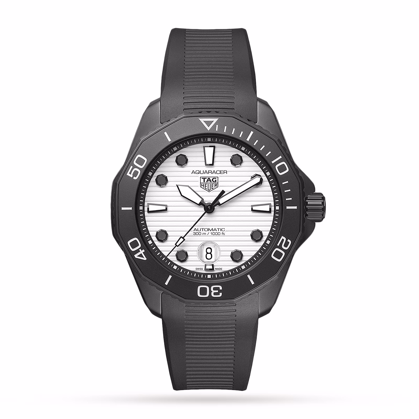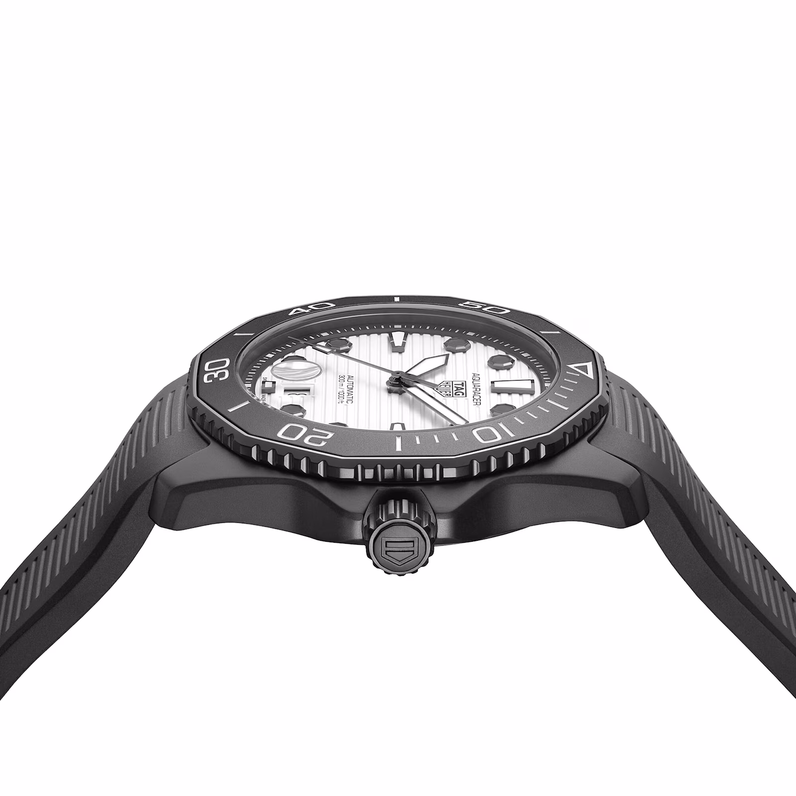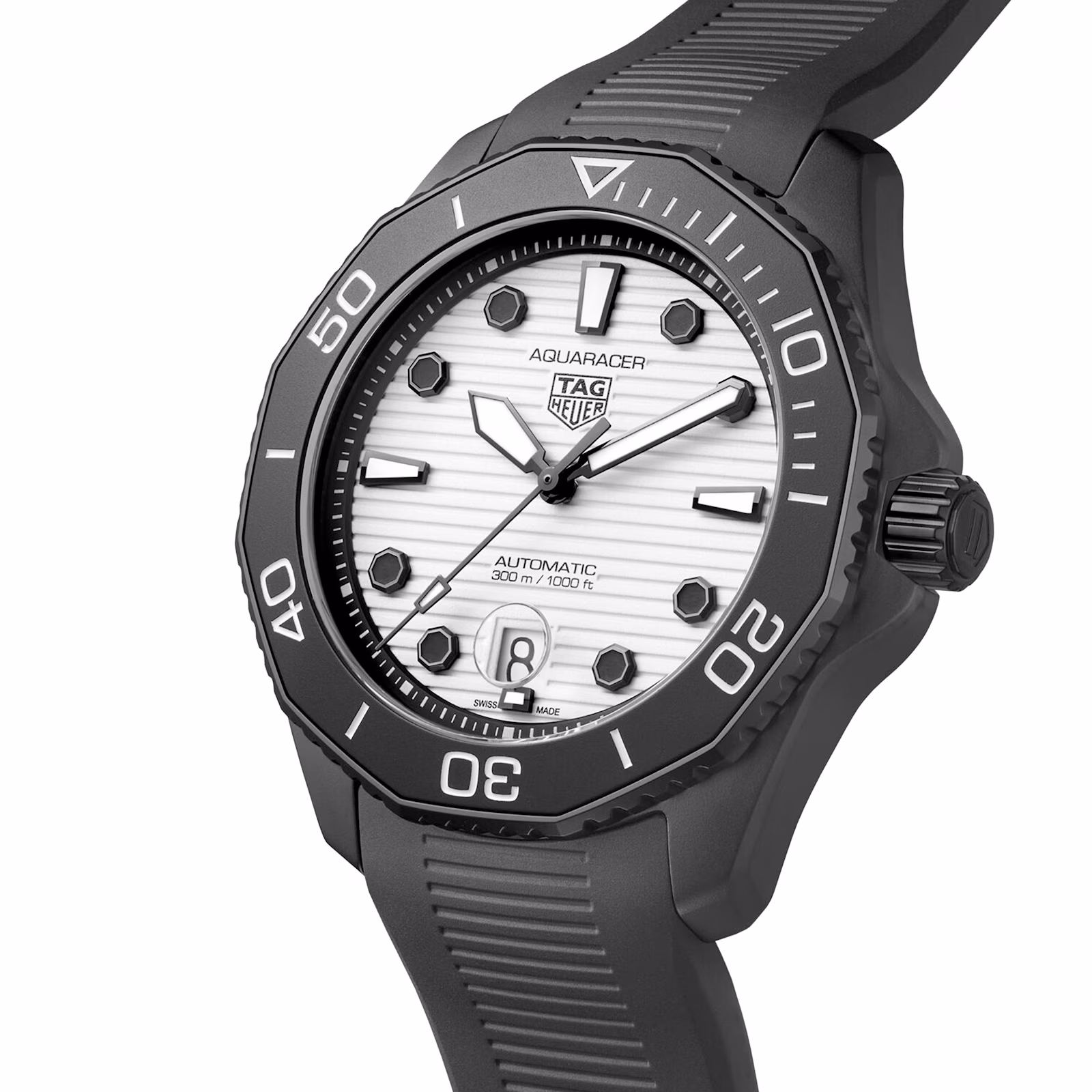 The luminescent white dial features a striking combination of white Super-Luminova® and black lacquer details, and a date display at 6 o’clock.