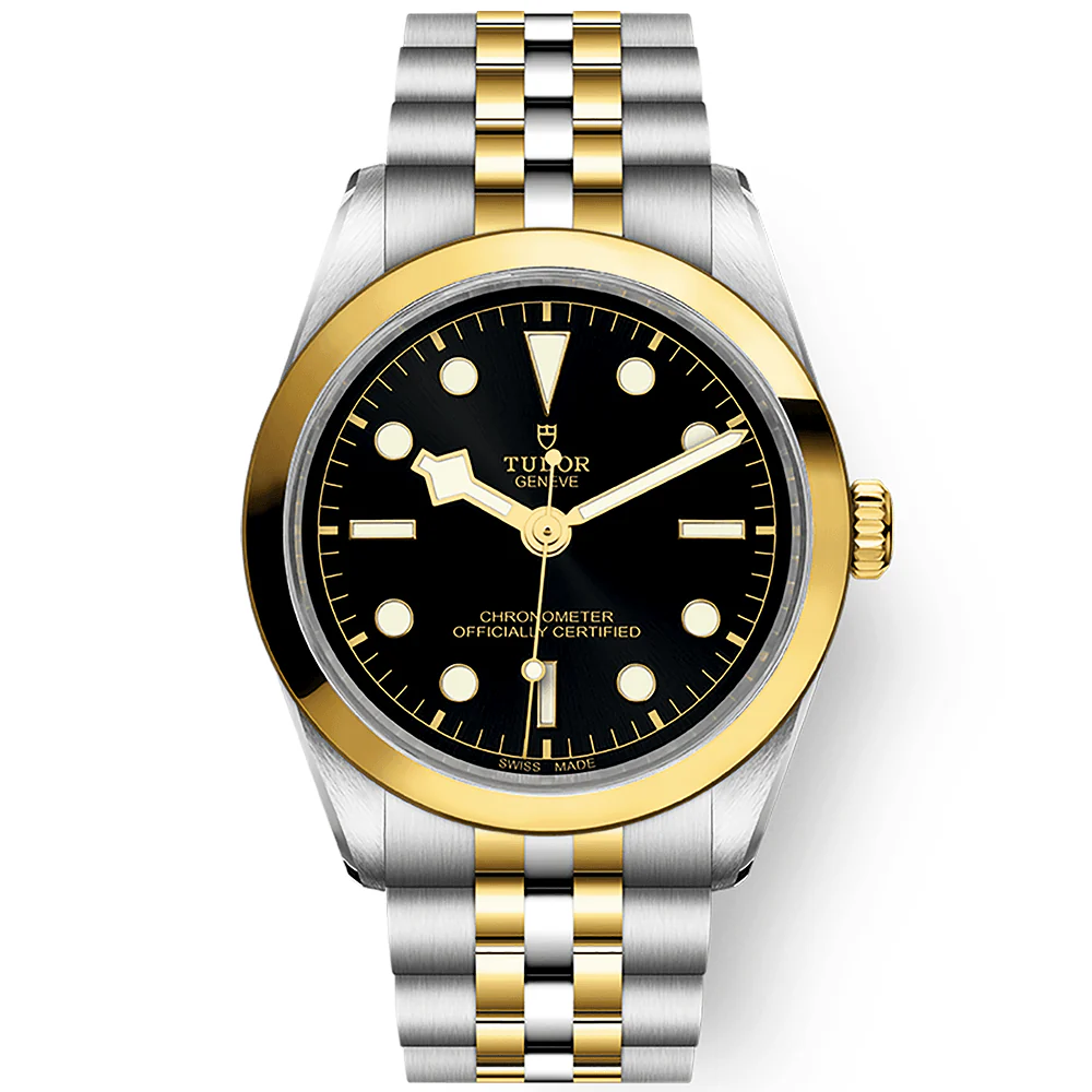 TUDOR Black Bay 36mm S&G Black Dial Automatic Ladies Bracelet Watch M79643-0001. Stainless steel & 18ct yellow gold 36mm case and bezel all on a matching two-tone steel & 18ct yellow gold bracelet. This ladies watch has a black dial with golden hands and hour markers. Water resistant up to 100m and sapphire crystal glass. Automatic movement.